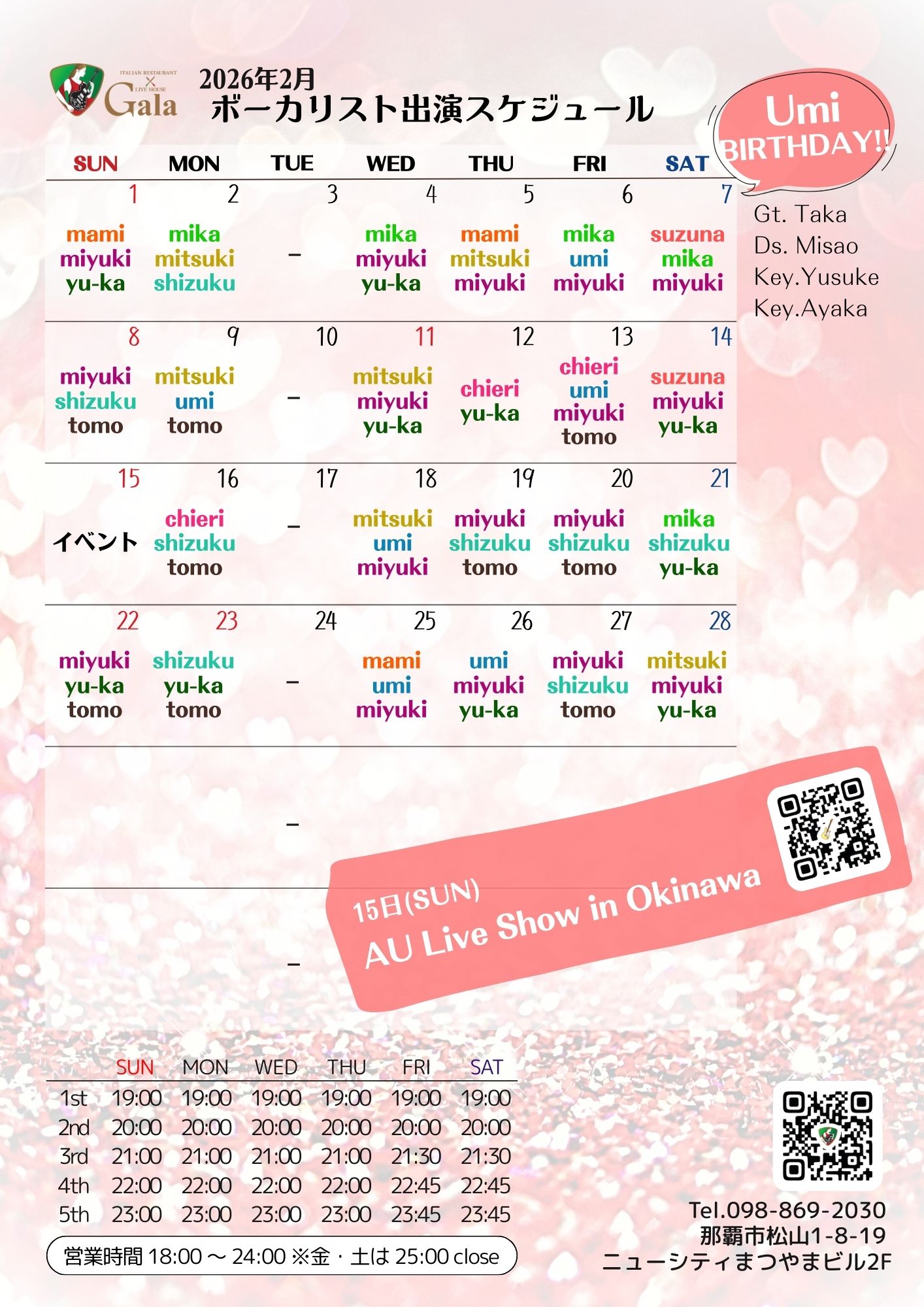 最初の角を右折してください。10メートルほど進むと左手2階にお店がございます。階段手前には看板が出ており、正面2階部分には煌々と輝くGalaの看板が。ゆいレール県庁前駅から徒歩5分の場所にあり、公共交通機関でのアクセスも抜群!